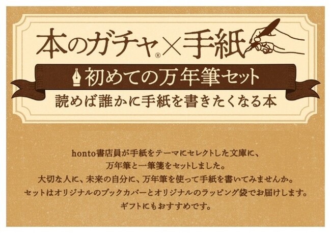 このたび「Fonte」が採用された「本のガチャ(R)×手紙 初めての万年筆セット」は、honto書店員が約6万タイトルの文庫から「手紙」をテーマに選書し、万年筆とインクと一筆箋(もしくはレターセット)をセットにした商品です。文庫は「手紙」をイメージしたhontoオリジナルデザインの紙製ブックカバーで包まれ、表紙を開くまで中身が分からない状態でお届けします。
