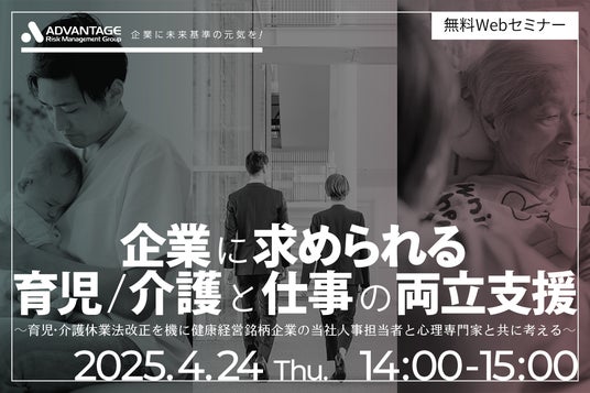 株式会社アドバンテッジリスクマネジメントは、2025年4月24日(木)に人事労務/両立支援のご担当者様・責任者様および産業保健スタッフ様を対象としたWebセミナー「企業に求められる育児/介護と仕事の両立支援」を開催いたします。本セミナーは日頃より従業員様からの様々な相談を受けている当社のカウンセラーと、自身も男性育休取得経験がある人事担当者より、育児や介護を両立する社員が直面するキャリアや産後うつの課題、ビジネスケアラーからの相談事例、仕事と介護を両立させる社員のサポート方法、当社の産育休、介護休支援策などを、対談形式でご紹介します。