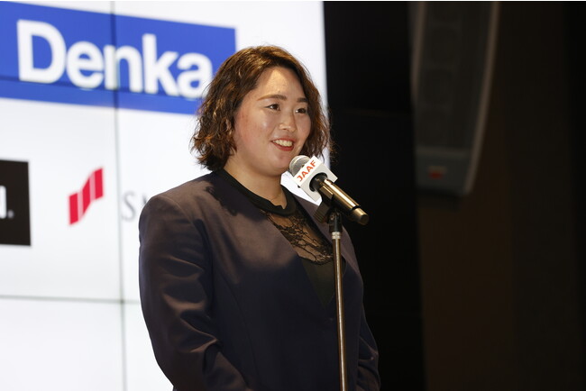 北口選手の激励に応える形で、認定ダイヤモンドアスリートを代表して壇に上がった柳田選手は、語学研修のプログラムや栄養サポート、さらには海外遠征を経験してきたなかでの実感や感謝を述べたのちに、「来年、再来年、そのまた次の年と、世界大会が続くので、ファイナルの舞台で走れるように頑張っていきたい。ダイヤモンドアスリートとしての価値を高められるような選手になっていきたいと思うので、今後とも、ご支援ご声援のほどよろしくお願いします」と力強くコメントし、会場から大きな拍手を集めました。