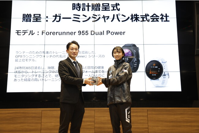 続いて、室伏マネジャーより、第9期認定ダイヤモンドアスリート7選手と、修了生3選手の名前が発表されました。各選手には、プレゼンターを務めた北口選手から、認定証・修了証のクリスタル盾が授与。ガーミンジャパン株式会社から、GPSランニングウォッチも贈呈されました。