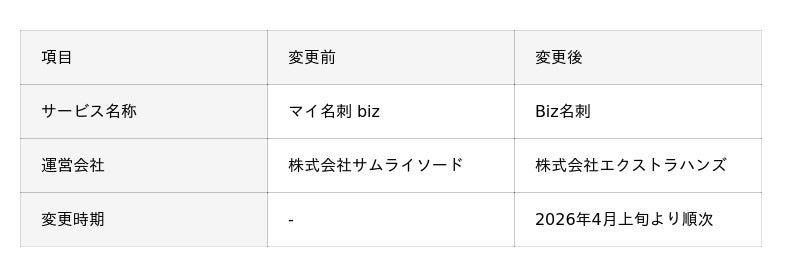 株式会社サムライソード(本社:東京都豊島区、代表取締役:比企良公、以下「サムライソード」)は、同社が運営する法人向けクラウド名刺発注サービス『マイ名刺 biz』について、サービス名称を『Biz名刺』へ変更するとともに、運営を100%子会社である株式会社エクストラハンズ(本社:東京都豊島区、代表取締役:岡村サンミ、以下「エクストラハンズ」)へ移管することをお知らせいたします。