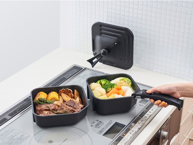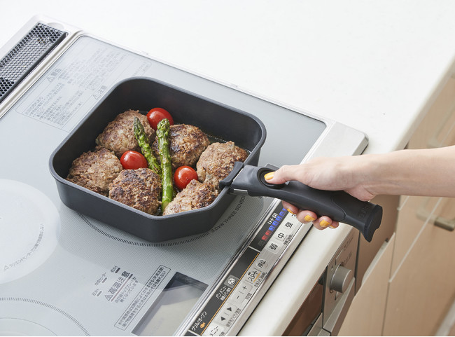 従来のsuttoフライパンはハンドルが固定されているタイプでしたが、立てて収納できる独自の形状はそのままに、ハンドルが取り外せるタイプも欲しいというご要望を多くいただき、開発に至りました。今回、発売する本製品は、フライパン自体が自立するのはもちろん、ハンドルが取り外しできるので重ねて収納することが可能となり、従来のsuttoフライパンより収納性が向上しています。