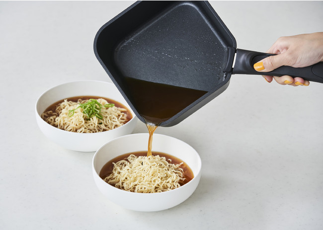 ハンドルを角に取り付けることで、フライパン本体の角が注ぎ口の役割となり、汁物を注ぎ入れたり、タレを回しかけたりと、盛り付け時に便利です。