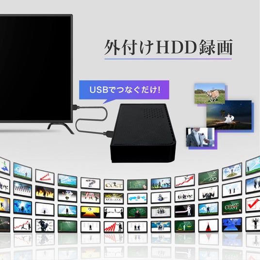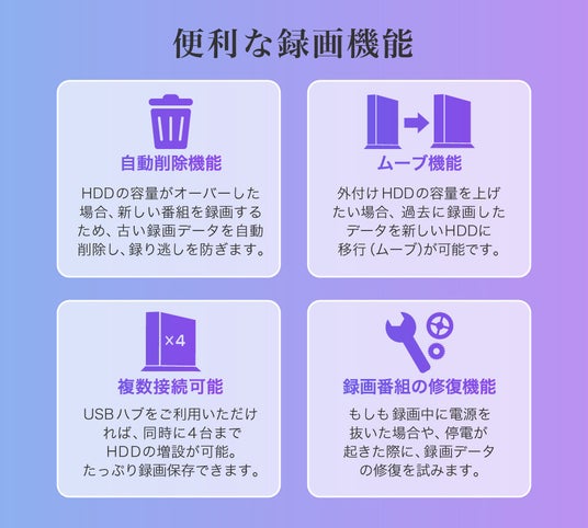 USB外付けHDD(別売)を接続することでレコーダーが無くても、かんたんに番組を録画できます。また、古いデータを自動的に削除する「自動削除機能」、過去の録画データを新しいHDDに移行できる「ムーブ機能」、最大4台のHDDを同時接続できる「複数接続可能機能」、録画中に電源コードが抜けたり停電になったときに録画データの修復を試みる「録画番組の修復機能」など、便利な4つの機能を搭載しています。