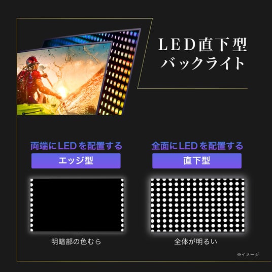 画面全体にLEDを配置することで、全体が明るく、色ムラの少ない発色豊かで綺麗な映像をお楽しみいただけます。