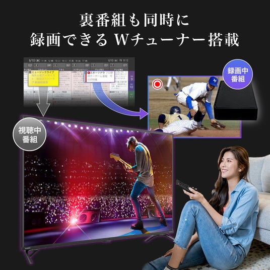 気になるテレビ番組を見ながら、他の番組を画面下でチェックできる「ミニ番組表」を搭載しております。また、搭載しているWチューナーで、視聴中の番組とは別の番組を録画することができる為、同時刻に見たい番組が重なっても見逃しの心配が無く、大好きなアーティストもスポーツもお楽しみいただけます。