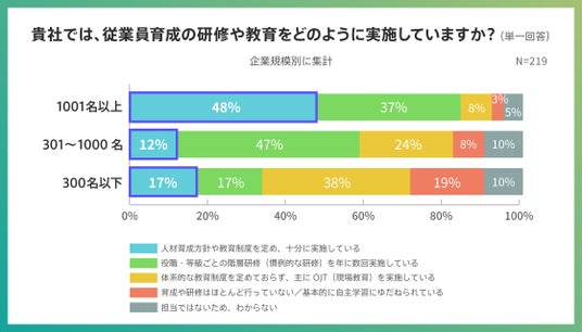 「人材育成方針や教育制度を定め、十分に実施している」割合が、1000名以上の企業が48%に対して、301~1000名は12%、300名以下は17%にとどまる