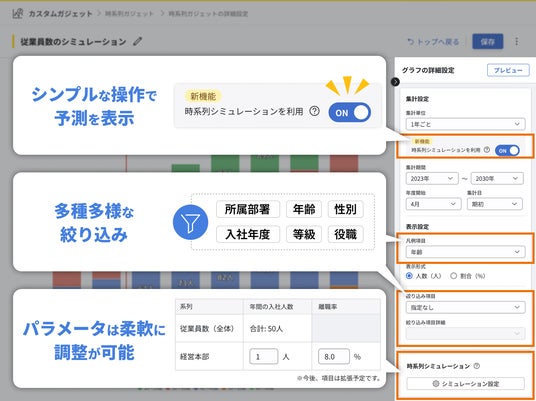 株式会社カオナビ(本社:東京都渋谷区、代表取締役社長CEO:佐藤 寛之、以下:当社)が提供するタレントマネジメントシステム「カオナビ」は、人材データの推移をグラフ化する「時系列ガジェット」において、将来の従業員数を自動で算出するシミュレーション機能を、今夏より提供開始します。