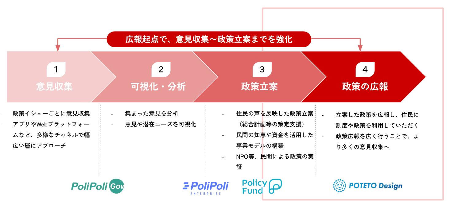 を融合させることで、自治体・省庁の「政策広報」を抜本的にDX(デジタルトランスフォーメーション)し、行政の考えを住民にしっかり届け、意見収集から効果的な政策立案までを強化することを目指します。