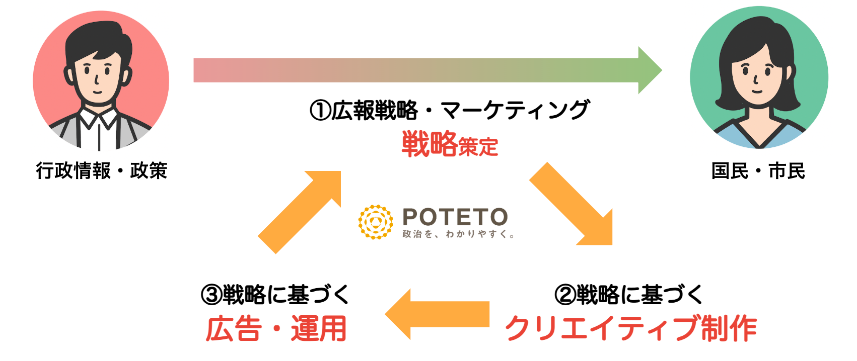 POTETOは、行政に特化した独自のクリエイティブとメディア運営ノウハウで、難しい政策を「分かりやすく」「届く」形で発信することに強みを持っています。