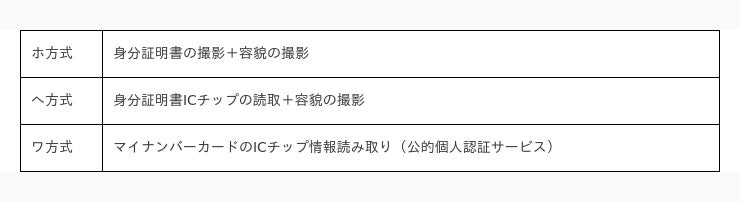 eKYCには、いくつかの手法が存在します。今回eKYCの利用については、犯罪収益移転防止法の中にある3つの手法、ホ、ヘ、ワ方式に限定して調査しました。