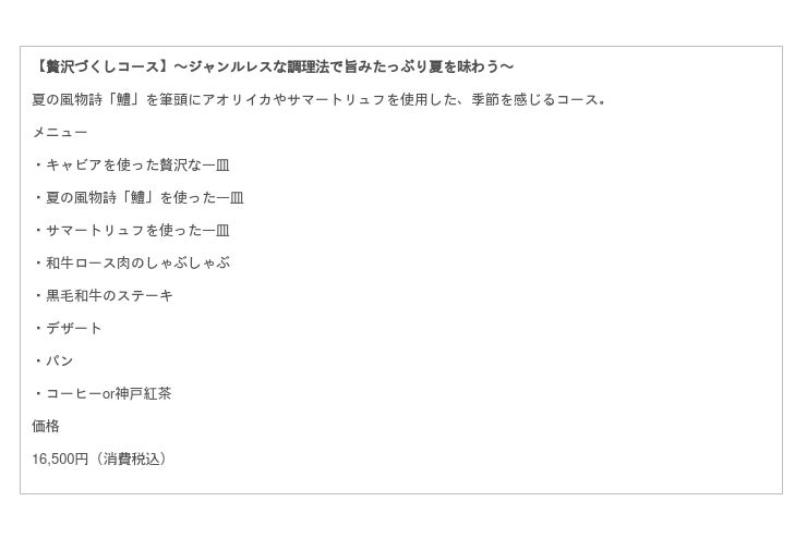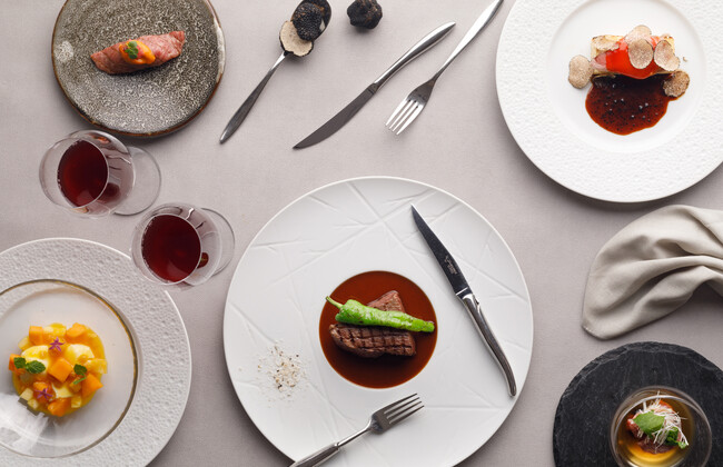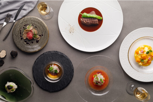 この夏は、夏の風物詩である「鱧」を筆頭にアオリイカやサマートリュフを使用した【贅沢づくしコース】や、肉寿司や卵とのマリアージュ、ステーキなどお肉を存分にご堪能いただける【黒毛和牛フルコース】、