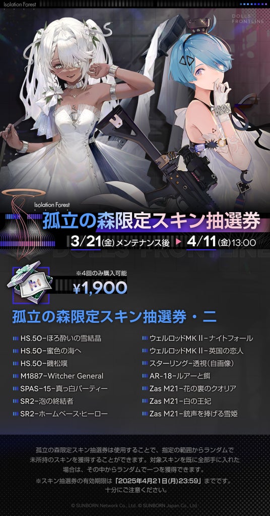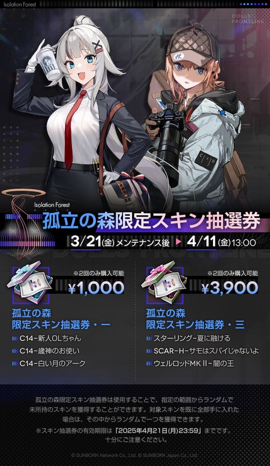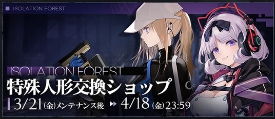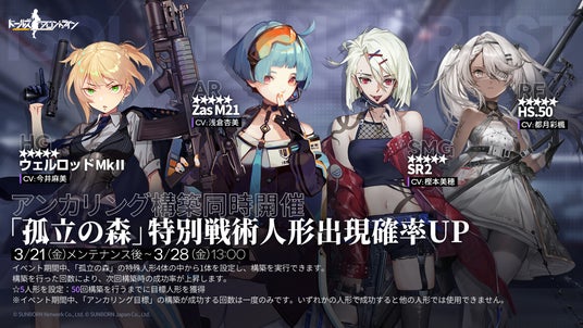 株式会社サンボーンジャパンは、スマホ向け戦略型シミュレーションゲーム『ドールズフロントライン(以下、「ドルフロ」)』において、本日3月21日(金)メンテナンス後より開催する、特別イベント「孤立の森」の追加情報をお知らせいたします。