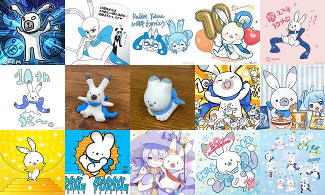 また、ユキネの公式X(旧Twitter)では、2023年11月1日(水)から記念日当日までのカウントダウン企画として、毎日異なる方に描き下ろしていただいた記念イラストを公開しております。10周年記念アイテムのイラストをご担当いただいたたかくらさんに加え、dera_furyさん(「SNOW MIKU 2014」衣装原案者)、猫魚さん(「SNOW MIKU 2014」メインビジュアル担当)、nekosumiさん(ラビット・ユキネ原案者)といったユキネに縁のある方々からもお祝いイラストをいただきました。そのほか、ユキネと関わりのあるクリプトンスタッフたちによるイラストを含む全15枚の記念イラストを公開しておりますので、この機会にユキネの公式Xにもご注目ください。“自称・エゴサーチが得意なウサギ”が、みなさまの反応をお待ちしております。