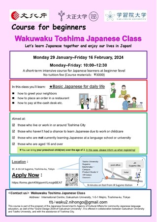 大正大学(学長:神達知純、所在地:東京都豊島区)と学習院大学(学長:荒川一郎、所在地:東京都豊島区)は共同で、2024年1月29日(月)から2月16日(金)※1に「はじめて学ぶ わくわくとしま日本語教室」を開催します。