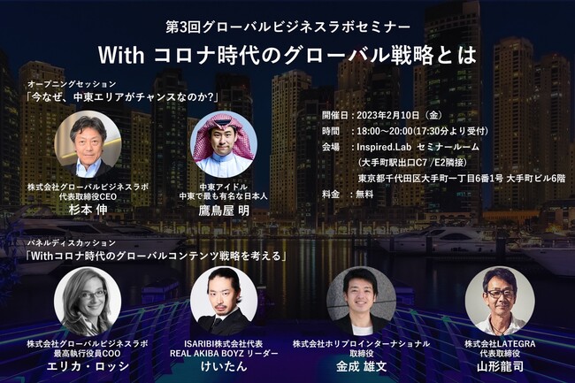 セミナーには同社代表取締役CEOの「杉本 伸」や「中東で最も有名な日本人サラリーマン」として著名な「鷹鳥屋 明」が登壇。