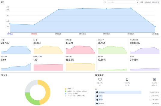 管理しているサイトごとに、日別・月別などの推移を直感的に把握できます。キャンペーン公開後の反応や、季節ごとのトレンドを難しい操作なしで追いかけられるようになりました。