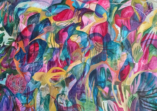 その後、FRAGIOはドイツ・ベルリンに拠点を移し、ヨーロッパやアジアを旅するなど創作は常に旅とも深く繋がってきました。自然に生きる動物たちや旅で訪れた土地の人々との心を開き合う体験がインスピレーションとなって絵を描き、音楽を奏でる。抽象、具象を問わず情報化に抗い、言葉になる手前のありのままをキャンバスに落とし込む…。