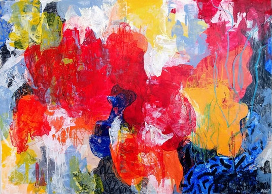 「筆を走らせる、色をのせる時の血が騒ぐ感覚はSaxophoneを演奏することに通じると感じる。それは一筆、色を塗る、線を引くのと同じように生命が燃えていると確信する。アーティストとしてのスタイルは音楽から得たものが大きい」と話すように、痺れるほどの波動の中で放たれる色、迷いのない旋律のように引かれる線は音楽を感じさせます。