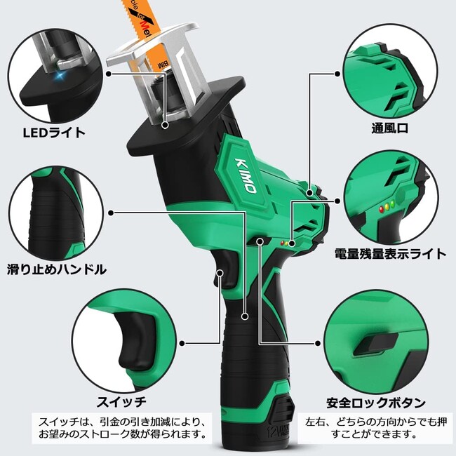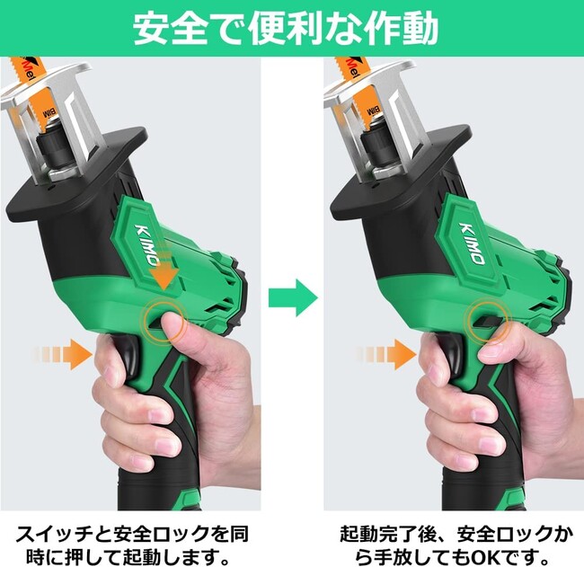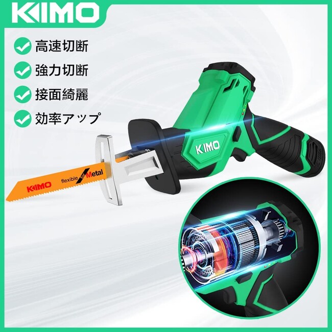 KIMO電動のこぎりは、ハイパワーであり、金属切断 木工切断を簡単で素早く、力をかけて押し付ける必要もなく、優れた切断能力で作業がはかどります。また、スイッチを押す力で無段変速、簡単に操作できて、望むどうりスムースに作業できます。連続使用時間10-15分