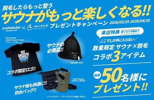 株式会社クリア(本社:東京都渋谷区、代表取締役社長:市川 智久)が運営するメンズ脱毛サロン「メンズクリア」は、ご新規様限定で、2026年3月25日(水)から2026年4月30日(木)までの期間、全国のメンズクリアにおいて、アパレルブランド「yoshiokubo」とのコラボサウナアイテムを抽選で50名様にプレゼントするキャンペーンを開催いたします。