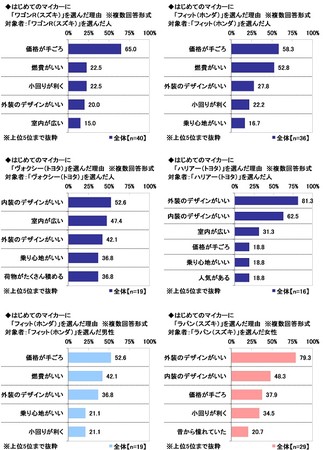 また、男女別にみると、男性1位の「フィット(ホンダ)」では「価格が手ごろ」(52.6%)、女性1位の「ラパン(スズキ)」では「外装のデザインがいい」(79.3%)が多くなりました。