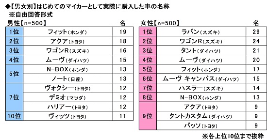男性回答1位「フィット」、女性回答1位「ラパン」