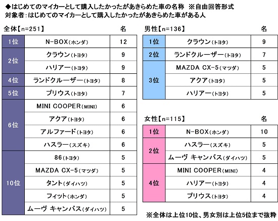 はじめてのマイカーとして購入したかったがあきらめた車がある方251名に、購入をあきらめた車の名称を聞いたところ、1位「N-BOX(ホンダ)」(12名)、2位「クラウン(トヨタ)」「ハリアー(トヨタ)」(いずれも9名)、4位「ランドクルーザー(トヨタ)」(8名)、5位「プリウス(トヨタ)」(7名)となりました。