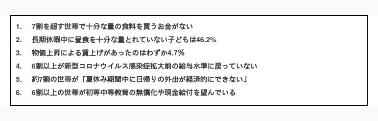 2022年以降3回目となる今回の調査では、長引く感染症による負の影響、物価高によって増す家計への負担、賃上げがほとんどない実態、長期休暇中の子どもたちの食事の制約など、これまでと比較してもより一層厳しい状況が浮かび上がっています。国が7月4日に公表した最新の調査では、2021年所得に基づく子どもの相対的貧困率は11.5%と、前回2018年調査よりも改善されていますが[1]、本調査で明らかとなった経済的に困難な世帯の子どもたちが直面する困窮は深刻であり、この夏休みも子どもたちが必要とする食料が得られない、学び・体験の機会が制約を受けることが強く危惧されます。