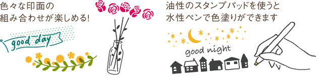 この度、新たに従来の4.5mm×32mmの印面サイズよりひと回り小さい4.5mm×20mmの印面のミニサイズを販売します。デザインのテーマは、「フラワー」「リーフ」「ラフパターン」「散歩」「お家」「今日の気分」の6種類。ミニだからこそ組み合わせ自由自在で、同じテーマ内で組み合わせても、異なるテーマを組み合わせても可愛くデコレーションを楽しむことができます。コンパクトな印面は手帳のマンスリーページなどの区切られた枠内や、小さなメッセージカードなどでも収まり良く押すことができて使い勝手抜群。また、油性のスタンプパッドを使用した上で、水性ペンなどで華やかに色付けするとよりかわいくデコレーションを楽しめます。