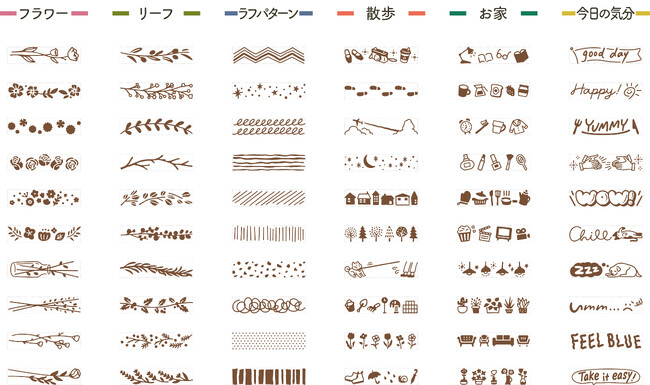 おしゃれなモチーフとして使用できる「フラワー」「リーフ」「ラフパターン」と、暮らしをテーマにしたデコレーションが楽しめる「散歩」「お家」「今日の気分」の計6種類のデザインをご用意。手帳や日記などのアレンジはもちろん、メッセージカード、ラッピングタグなど、さまざまな場面で使用しやすいデザインです。