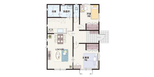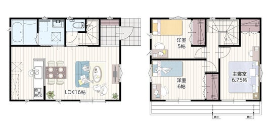 16帖のLDKを中心とした家族が自然と顔合わせる間取り。全室収納完備、人気の対面式キッチンで料理中でも家族と会話しながらコミュニケーションがとれるプラン