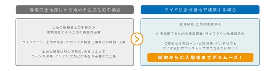 注文住宅を検討するにあたって、土地探しから始める場合、土地と建物を別途購入するため、予算オーバーとなるケースは少なくありません。そこでアイダ設計は、土地から購入して注文住宅を建てたい方に向けて、「土地+自由設計注文住宅」の企画をスタートしました。