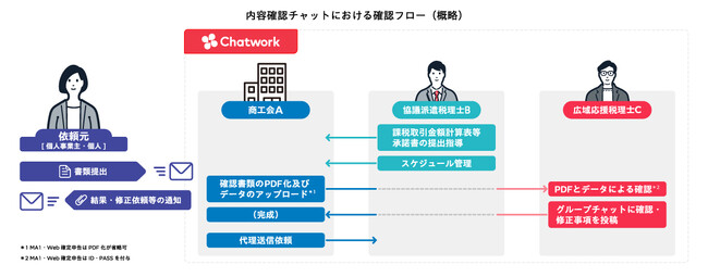 協議派遣税理士は、商工会等の団体に対して必要書類・データの提出指導やスケジュールなどの全体管理、e-Tax等を利用した確定申告の代理送信を行います。それらをサポートする形で、広域応援税理士がPDF化された書類やデータの内容確認、修正依頼をチャット上で行います。