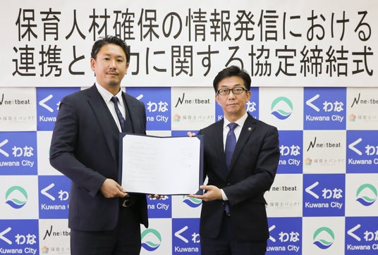 日本最大級の保育士専門の就職・転職支援サービス「保育士バンク!」を運営する株式会社ネクストビート(本社:東京都渋谷区、代表取締役:三原誠司)は、三重県桑名市と「保育人材確保の情報発信における連携と協力に関する協定」を締結いたしました。就職・復職活動中の保育士や市内保育施設に対して、双方の資源やノウハウを活かした支援を行うことで、「“桑名市版”保育現場充実パッケージ(※)」の情報発信を図り、市内の園における保育人材確保、子どもたちが安心して過ごせるような保育環境の実現に寄与することを目指します。