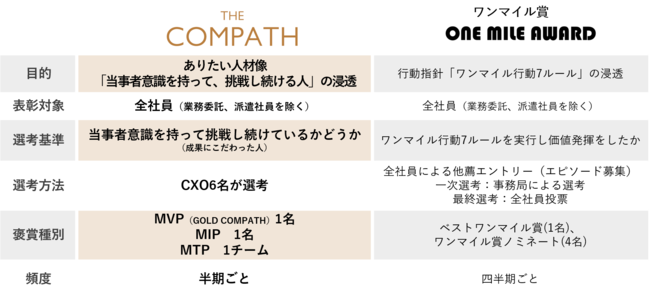 「THE COMPATH」が、ありたい人材像の浸透を目的に、CXO(役員クラス)が選考するトップダウン式の社内表彰制度であるのに対し、「ワンマイル賞」は全社員による推薦・投票で選ばれるボトムアップ式の社内表彰制度です。