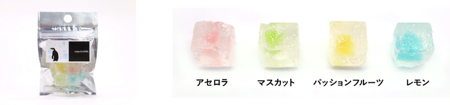 コロッとした見た目が可愛い氷キャンディは、本当の氷を食べているかのような食感を目指して、PAPABUBBLEの職人が作り上げました。はじめに口の中で溶かしながらシャンパン風味のキャンディを味わい、中のグミが出てきたらバリバリと噛んで召し上がっていただくと美味しく楽しめます。また、ソーダに入れて少し溶かしながら食べていただくのもお薦めです。フレーバーは、アセロラ・パッションフルーツ・レモンに、今期新しいフレーバーのマスカットを加えた4種をラインナップ。キャンディ周りにまぶしたキシリトールが、ひんやりした感覚をより引き出してくれます。