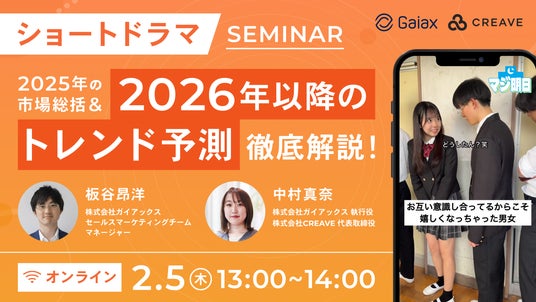 クリエイターとの共創を通じて企業のマーケティング課題を解決する、株式会社CREAVE(本社:東京都千代田区、代表取締役社長:中村真奈、以下 CREAVE)は、2026年2月5日13時~『2025年のショートドラマ市場総括・2026年以降のトレンド予測セミナー』を開催いたします。