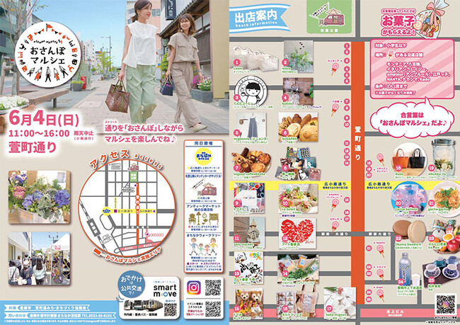 また、萱町通りの店舗を知ってもらおうと、沿道の8店舗で小学生以下を対象にお菓子の詰め合わせをプレゼントします。行きたいお店を1つ選び、お店で合言葉「おさんぽマルシェ」を言ってください。1人1回限りで、お菓子がなくなり次第終了となります。