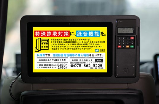 兵庫県では特殊詐欺の未然防止施策として様々な施策を行なっております。また、捜査機関より法令に基づく照会があった場合、タクシー事業者側ではドライブレコーダー映像を、GOが運営するタクシーアプリでは該当者の移動データを提供するなど、各社が日頃より捜査協力を行なっております。そして、兵庫県が現在行なっている、自動録音電話機等の購入補助については、兵庫県タクシー協会に所属するタクシー事業者各社では2024年7月より告知ステッカーの車内掲示を行なっております。県民の皆さまの移動が特に活発となる年末年始に向けて、新たにタクシー車内の後部座席タブレットで流れるタクシーメディア『TOKYO PRIME』にて、告知画像を放映します。2024年10月21日(月)から2025年1月12日(日)までの期間、県内のGO加盟タクシー事業者の一部、7社約350台での放映を予定しています。三者では、本取り組みを通じて安心・安全なまちづくりを目指します。