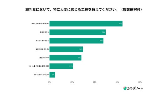 離乳食において特に大変に感じる工程として、「調理(下処理・調理・保存)」が65%と最も多く、次いで「献立を考える(50%)」、「子どもに食べさせる(48%)」と続きました。準備から片付けまで、負担が途切れなく続くことが見て取れます。