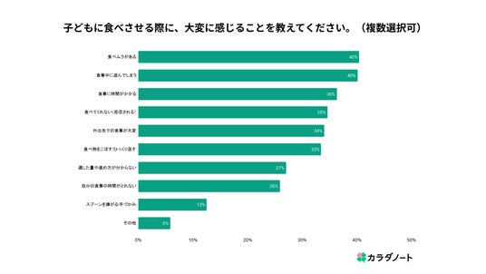 子どもに食べさせる際の悩みでは、「食べムラがある」「食事中に遊んでしまう」がいずれも40%と高く、「食事に時間がかかる(36%)」、「食べてくれない(35%)」と続きました。さらに、「外出先での食事が大変(34%)」「食べ物をこぼす(33%)」「適した量や進め方がわからない(27%)」など、成長段階ごとに多様な悩みが存在することも明らかとなりました。