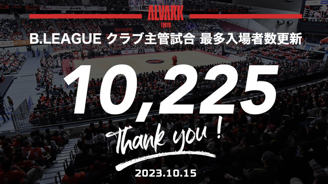 2023年10月14日(土)に、2023-24シーズン 第2節 宇都宮ブレックス戦@国立代々木競技場第一体育館で記録した10,040名を上回り、B.LEAGUE クラブ主管試合 1試合 最多入場者数を更新し新記録を樹立しましたので、お知らせいたします。昨日から2日連続の10,000名超えとなり、土日で合計で20,265名にご来場いただきました。