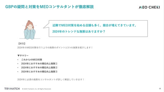 トライハッチのMEOコンサルタントが、MEO対策に関する疑問点についてレポート内で詳細に回答しています。