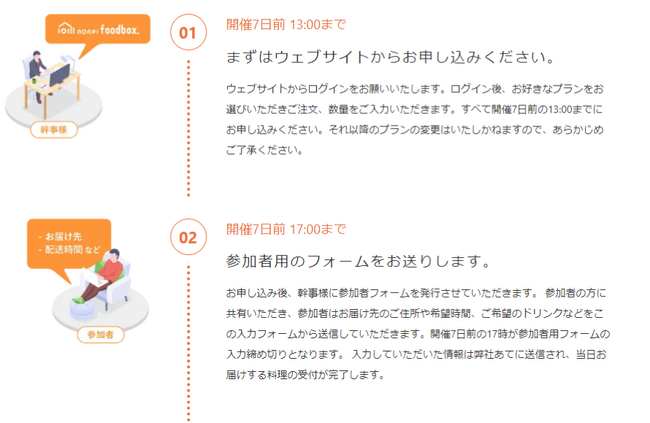nonpi foodbox(R)はオンライン、対面、ハイブリッド、様々な形式の集まりで手軽に食事手配ができるデリバリーサービスで、料理や飲み物を全国にお届けしております。