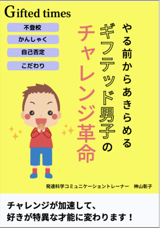初めまして。親子のコミュニケーションをスムーズにして子どもの発達を加速する「発達科学コミュニケーション」子育て講座講師の神山彰子と申します。この度、ギフテッド男子を理解し、才能を伸ばすきっかけとして欲しく、ギフテッドやる気のないギフテッド男子に響く!不登校・かんしゃく・こだわり・自己否定する子がやる気になる「やる前からあきらめるギフテッド男子のチャレンジ革命」無料電子書籍をリリースいたしました。