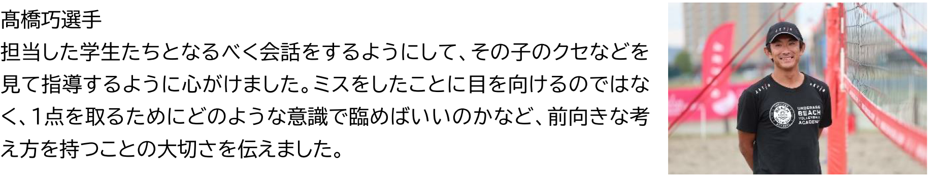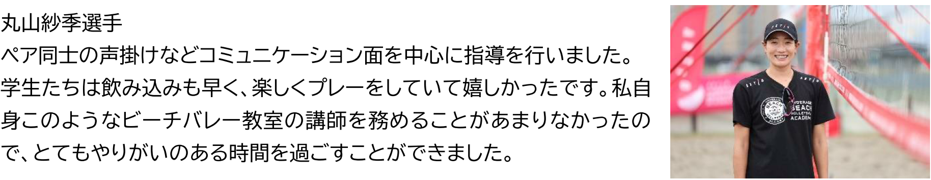 プロのビーチバレーボール選手から直接指導を受け、色々と学ぶことができて有意義な時間でした。アタックの打ち方やレシーブの構え方などを教えてもらい、最初はうまく出来なかったのですが、講師の方が優しく丁寧にアドバイスをしてくれたおかげで、だんだんと出来るようになりました。