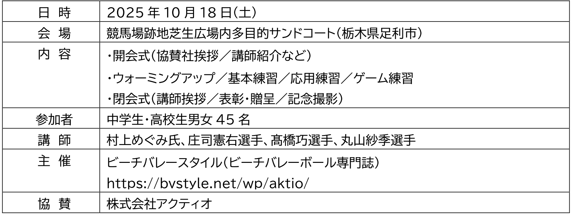 総合建設機械レンタルの株式会社アクティオ(本社:東京都中央区日本橋、代表取締役社長兼COO:小沼直人、以下アクティオ)は、ビーチバレースタイルが主催する、部活動でビーチバレーボールに取り組む中・高校生を対象にしたイベント「AKTIO アンダーエイジ・ビーチバレーボール・アカデミー」に冠協賛をしております。今回で12回目となるアカデミーを2025年10月18日(土)に栃木県足利市の競馬場跡地芝生広場内多目的サンドコートで開催いたしました。