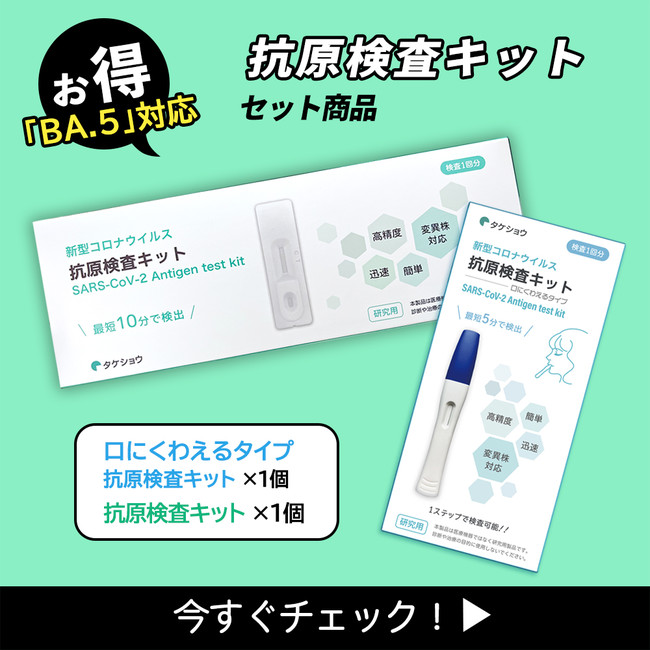 タケショウショップでは、抗原検査キットが2種類各1個ずつ入った新しいセット商品を発売いたしました。個別購入よりお安くご購入いただけますので、この機会にお試しくださいませ。