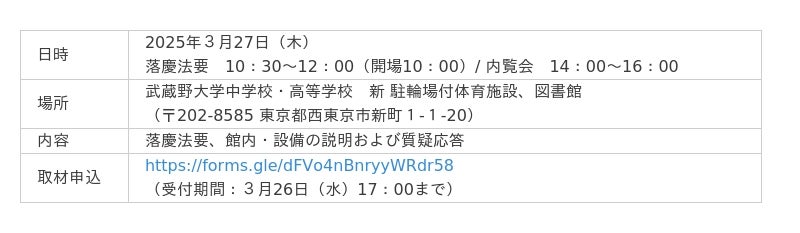 学校法人武蔵野大学(東京都江東区)は、3月27日(木)に武蔵野大学中学校・高等学校の新たな駐輪場付体育施設、図書館の落慶法要・内覧会を開催します。